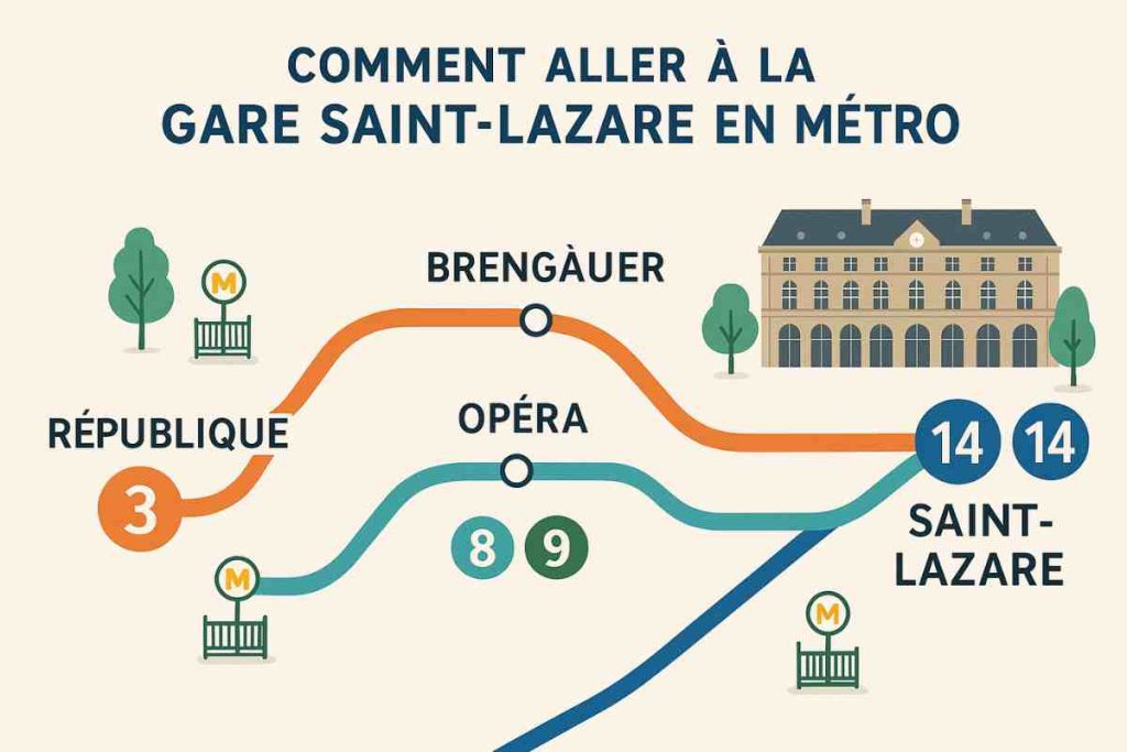 La station Saint-Lazare bénéficie d'une desserte directe par quatre lignes de métro : les lignes 3, 12, 13 et 14. Cette configuration exceptionnelle en fait l'une des stations les mieux connectées du réseau parisien.